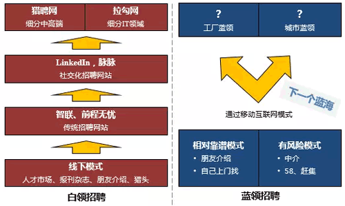 通過(guò)分析整個(gè)招聘行業(yè),我們看到白領(lǐng)招聘已經(jīng)互聯(lián)網(wǎng)化并進(jìn)入細(xì)分競(jìng)爭(zhēng)階段。由于智能手機(jī)的普及,藍(lán)領(lǐng)招聘剛剛進(jìn)入移動(dòng)互聯(lián)網(wǎng)化的窗口期,尚未有成型的玩家出現(xiàn)。信息源:揭陽(yáng)人才網(wǎng)_m.shroysun.com